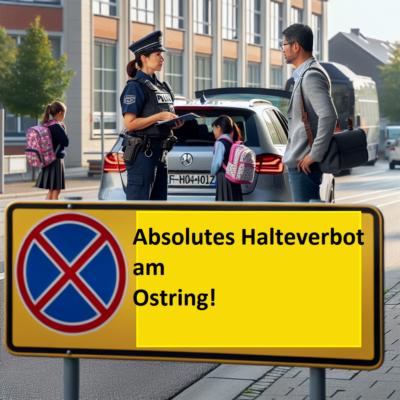 Aufgrund der einsetzenden dunklen Jahreszeit weisen wir noch einmal auf das absolute Halteverbot am Ostring hin. Dort zu halten, um Schülerinnen oder Schüler aussteigen zu lassen, gefährdet andere Kinder. Wir stehen im Dialog mit Polzei und Ordnungsbehörde, damit der Schutz aller Kinder durchgesetzt werden kann.